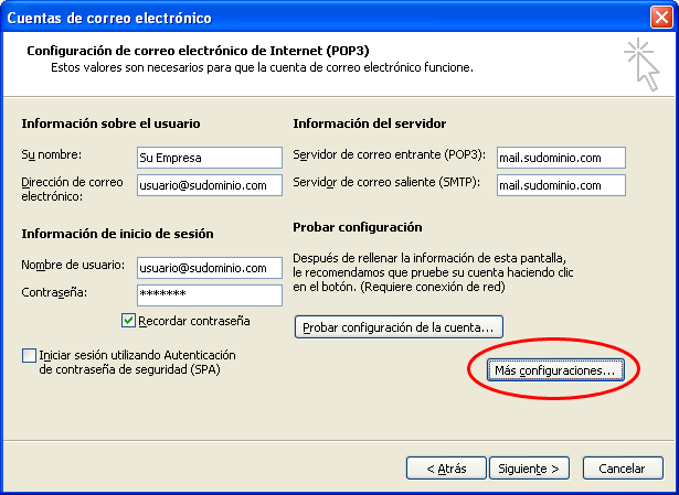 En la caja de texto "Servidor de correo entrante (POP3): mail.sudominio.com. ( Deberá usar su propio dominio antecedido de la palabra mail )
