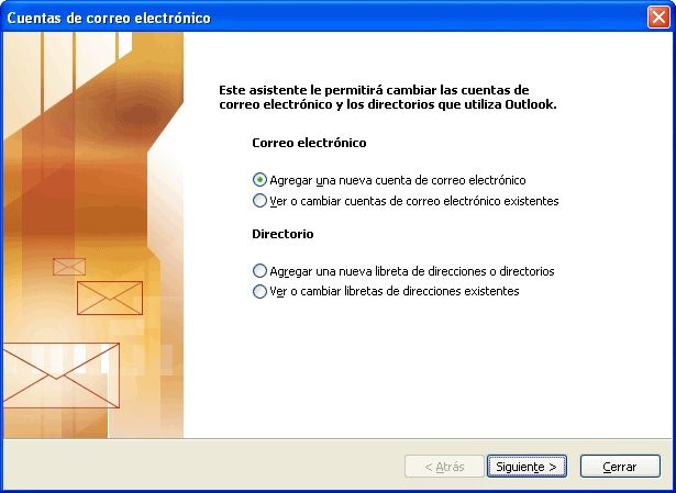 Paso 2.- Se muestra la siguiente ventana y se debe seleccionar "Agregar una nueva cuenta de correo electrónico" y posteriormente pulsar el botón "Siguiente".