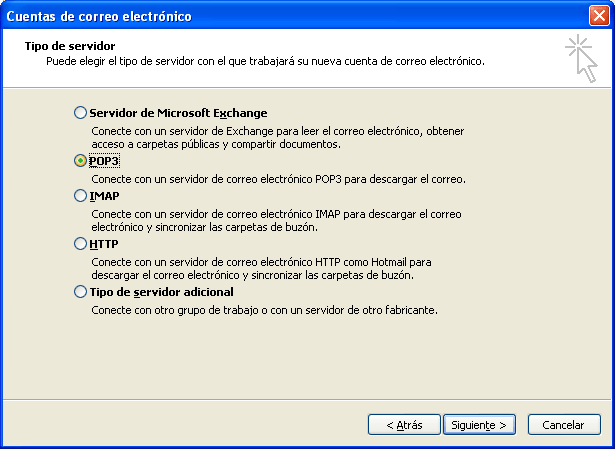 Paso 3.- En la siguiente ventana se muestra debe seleccionar la opción "POP3 " y posteriormente debe pulsar el botón "Siguiente"